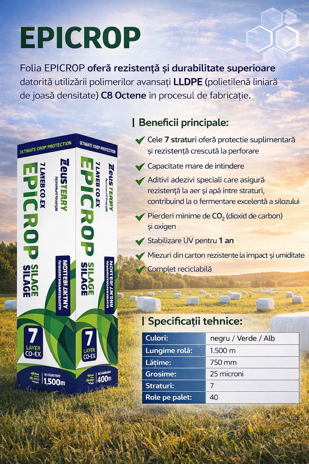 Produse profesionale pentru balotare și ambalare în agricultură: folie pentru baloți, sfoară agricolă și plasă pentru balotat. Soluții rezistente, ideale pentru ferme și producători agricoli.